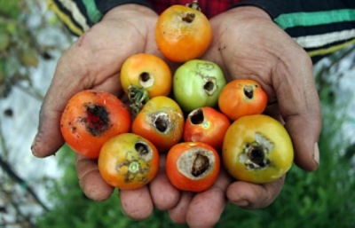 Tomat yang terserang hama ini akan mengalami pembusukan dan terdapat belatung di dalamnya.