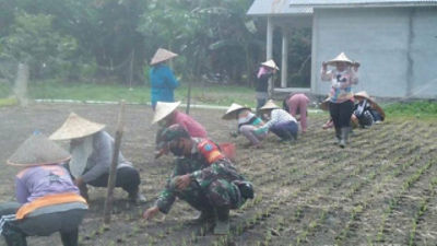 TRIBUNPONTIANAK.CO.ID, BENGKAYANG - Babinsa Koramil 1202-03/Sungai Raya Serda Pujianto membantu dan mendampingi masyarakat bersama Poktan Cahaya Tani menanam padi di Dusun Guntur Rt 06/Rw 02 Desa Rukmajaya Kecamatan Sungai Raya Kepulauan, Kabupaten Bengkayang, Minggu 9 Mei 2021.