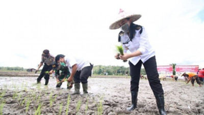 TRIBUNPONTIANAK.CO.ID, LANDAK - Bupati Landak Karolin Margret Natasa melakukan tanam padi di Desa Sebangki, Kecamatan Sebangki, Landak pada Rabu 4 Nopember 2020.