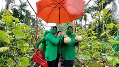 SERAMBINEWS.COM, SINABANG - Sebagai upaya membangkitkan ketahanan pangan bagi masyarakat di masa Pandemi Covid-19, Komandan Kodim 0115/Simeulue Letkol Inf Yogi Bahtiar SKom MBA didampingi Ketua Persit KCK Cabang XXXIII serta pengurus kelompok Tani Kuta Sejahtera dan kelompok Tani Orip Bersama, binaan Koramil 02/Simeulue tengah melakukan panen raya holtikultura jenis buah melon dan sayuran di Desa Desa Luan Surep dan Desa Laure'e, Kecamatan Simeulue Tengah, Jumat (22/10/2021).