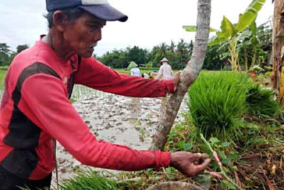 Kini, ia menggarap sawah seluas 1.000 meter persegi itu untuk kemudian memanen sekitar 450 kilogram beras. Senada dengan Sudi, Mohammad, 65 juga melakukan hal yang sama. Meski sedikit terganggu dengan hama keong, namun pihaknya optimis lahan seluas 1.000 meter persegi yang digarapnya itu bisa panen dengan baik.
