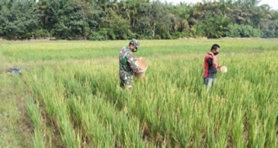 Pantauan di lokasi, terlihat Serka Hermansyah dan petani berada di tengah sawah. Sambil berinteraksi mereka menaburkan pupuk jenis Fonska dan Urea dengan maksud agar padi tumbuh sumbur.