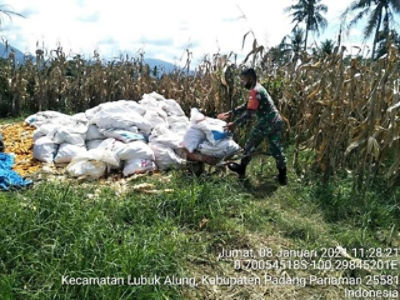 Bintara Pembina Desa (Babinsa) Koramil 05/Lubuk Alung Kodim 0308/Pariaman Serda Ilham Hidayat melaksanakan upaya khusus (Upsus), berupa pendampingan panen jagung milik Ema di Kampung Sabalah, Kecamatan Lubuk Alung, Kabupaten Padang Pariamam, Jumat (08/01/2021).
